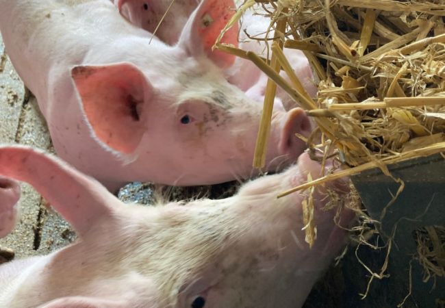 Schweine sind intelligent und neugierig. Daher bieten Landwirtinnen und Landwirte ihnen Spielzeug an. Als Beschäftigungsmaterial kommen Strohraufen, Holz, Beißbälle, Kordeln, Massagebürsten oder Spielbälle zum Einsatz. Damit können die Schweine auch ihrem Wühltrieb und Beschäftigungsdrang nachgehen.